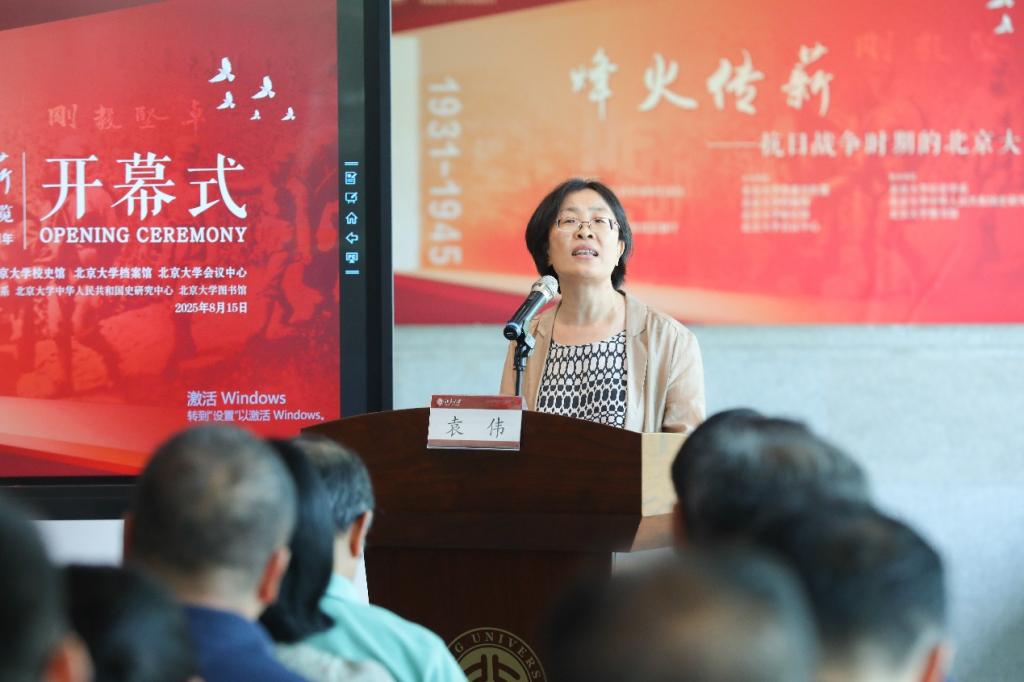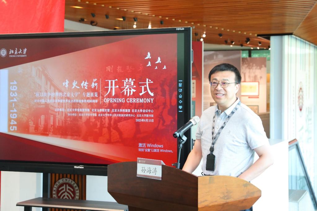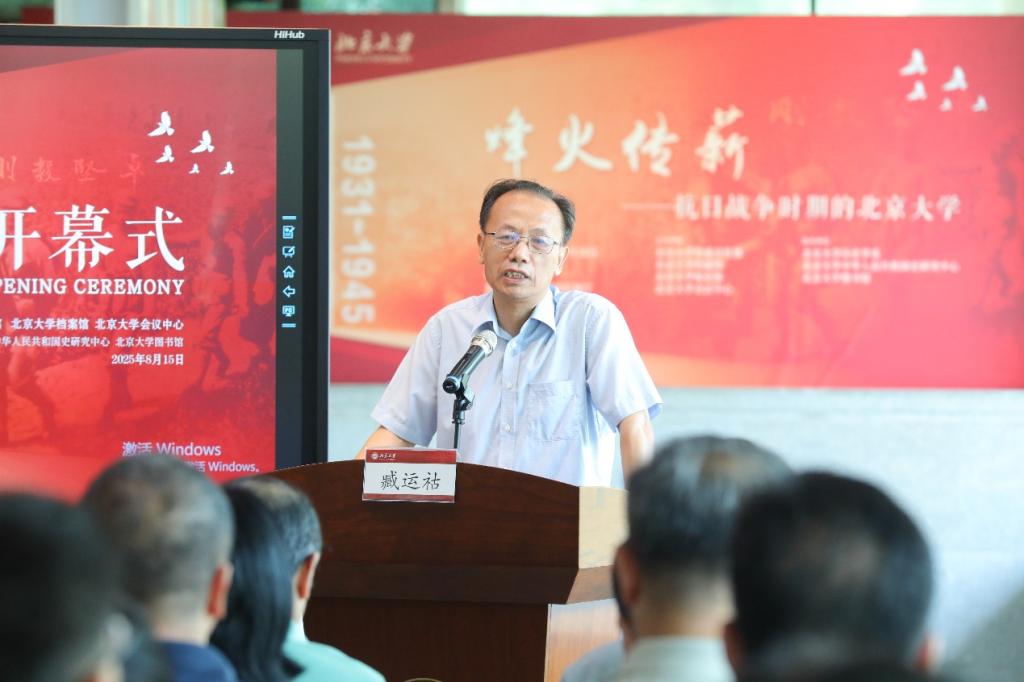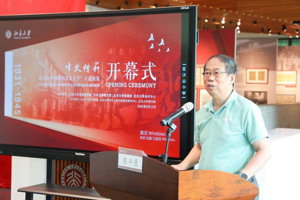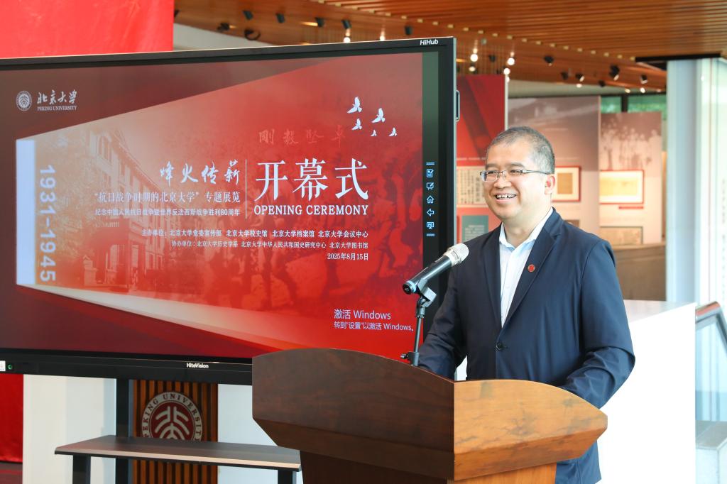 2025年是中国人民抗日战争暨世界反法西斯战争胜利80周年。8月15日上午,“烽火传薪——抗日战争时期的北京大学”展览开幕式在校史馆序厅举行。北京大学副校长朴世龙,郑天挺先生之子、北京航空航天大学教授郑克扬,中国语言文学系教授陈平原,历史学系教授臧运祜,清华大学档案馆校史馆馆长孙海涛,南开大学档案馆馆长袁伟等嘉宾,以及学校各院系、职能部门的老师60多人共同出席展览开幕式。开幕式由档案馆校史馆馆长余浚主持。