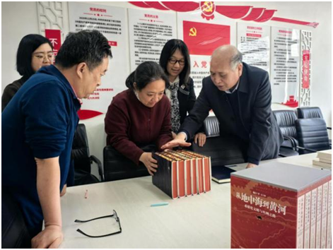 杨巨平教授向与会人员讲述了系列著作的研究过程,重点介绍了《从地中海到黄河——希腊化文明与丝绸之路》(六卷本)的基本情况。该套书籍为函套刷边限量版,装帧华丽,印刷精美,六卷本的书口彩绘组成了完整的云冈石窟飞天图案,别具匠心地表达了该书“丝路文明交融互鉴”的深刻内涵,兼具学术价值和收藏价值。他表示,将其捐赠给档案馆,可实现他和中外团队成员保存重要学术研究成果,助推学科文脉传承的心愿。