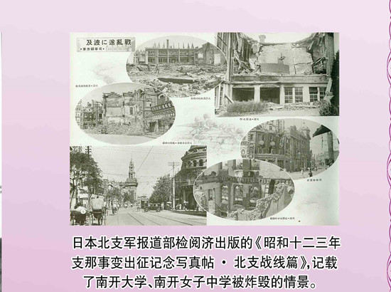 此次展览通过图片的形式再现了这段南开人不能忘记的历史。首次公开的档案中,日本北支军报道部检阅济出版的《昭和十二年支那事变出征记念写真帖·北支战线篇》、E鲍克博士拍摄的校舍照片,真实反映了南开大学、南开女子中学被炸毁的情景。