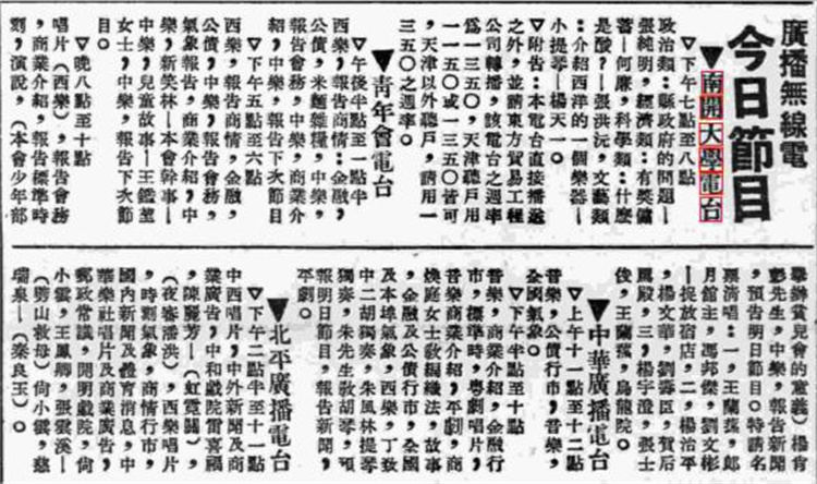 1934年12月14日天津《大公报》刊载的各广播电台节目单 1934年11月,南开大学决定开办广播电台,利用这一当时最为先进的传播方式,向社会传布各种关于社会与民生的知识。随后8个月时间里,南开大学以师生协作,全校参与的方式,共推出了林同济讲《美国对远东问题最近舆论》、何廉讲《有奖储蓄》、杨石先讲《铝锅有毒么》、黄钰生讲《谁应该教我们的国民》、张彭春朗诵陶行知的诗等一百余个节目,展现南开学术和文化魅力,体现师生爱国报国担当。 在当时多数电台以戏曲、曲艺等娱乐节目为主的情形下,南开大学广播电台以其丰富、有意义的内容,为新闻媒体所推重,经常位于《大公报》《益世报》节目预告单首位,被认为是“天津市最小而意义最高的广播电台”,受到广泛关注与好评。 校园体育、民众体育与南开